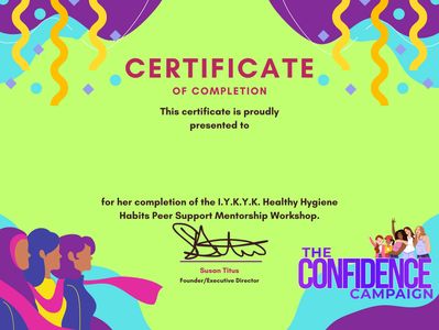Includes: Personalized certificate of completion, hygiene education, peer mentoring tips, and hygiene items to take home.
